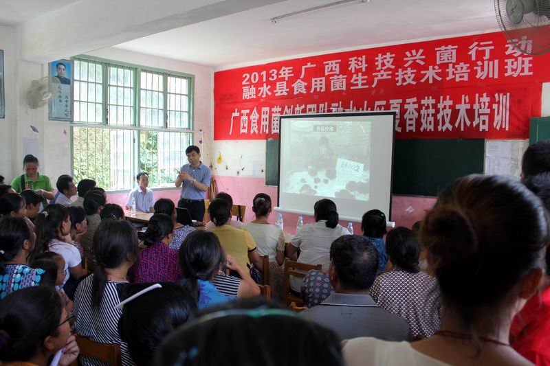 21日上午在香粉乡举办山区夏香菇Manbetx体育手机版推荐A9版本培训,区团队专家亲自授课,为使山区群众听懂,使用桂柳话讲课,结合文字图片和视频,通俗易懂,群众很容易理解,课堂气氛很活跃,加上附近有夏香菇生产现场,许多农民已有很好感受;午后没有休整驱车赶到怀宝镇检查杉树林下栽培已进入收获季节灵芝,了解到目前鲜灵芝收购90元/斤,价位很好;22日在杆洞乡莫明生乡长等领导的带领下到山上苗寨参观了解利用砍伐后遗留松树蔸栽培茯苓、竹木棚下栽培竹荪、毛竹林下栽培灵芝等药用食用的基地调研和技术传授,和当地乡、村领导一起就如何加快当地Manbetx体育手机版推荐A9版本产业发展的思路和模式等方面进行了探讨。