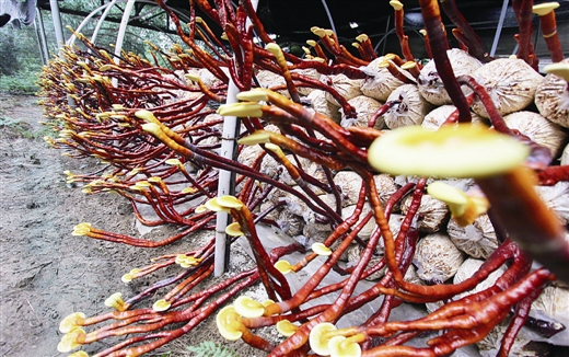 灵芝大棚十分宽敞,有几条通道,通道两边一袋袋培养基摞得整整齐齐,而灵芝则从培养基的两头长了出来,可谓是密密麻麻,和人们印象中的“仙草”似乎相去甚远。鹿角灵芝,因其菌柄酷似鹿角而得名,菌柄呈红褐色,看起来就像是上过漆的艺术品,每个菌柄顶则长有一个黄色菌盖。