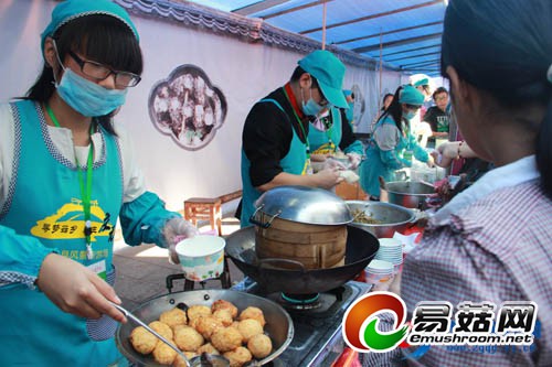 不仅如此,其他特色美食展位也使出浑身解数在“菇”上做文章:菇香酱鸭腿、菇乡饭团、香菇丸、社粿、龙爪粟饼、珍菌煎饼、巧拌菌菇……这些美味的特色小吃融入了菇乡的生态气息。“这些美食味道好是关键,更重要的是够生态、够健康。”市民吴小兰说,这一届美食节不论是从展位的布置、工作人员的着装,还是食物的选材上,都紧紧围绕着原生态的主题,真可谓挑动了食客的味蕾。(图/易菇网)