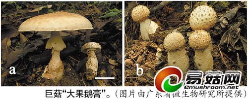 据介绍,这一巨型蘑菇是广东省微生物研究所李泰辉博士、邓旺秋博士、李鹏博士及中国科学院昆明植物研究所鹅膏专家杨祝良博士共同研究发表的。蘑菇长在白云山西南面、海拔260米高的一条山路小径旁。“这种蘑菇菌盖宽40多厘米,高度也达到40多厘米,属于蘑菇中的‘巨人’。”邓旺秋博士介绍,以往在白云山上发现的肉质蘑菇,体积一般为3~10厘米,个别较大的种类菌盖宽度也只可以达到15~20厘米左右,但宽达40多厘米的还是首次发现。