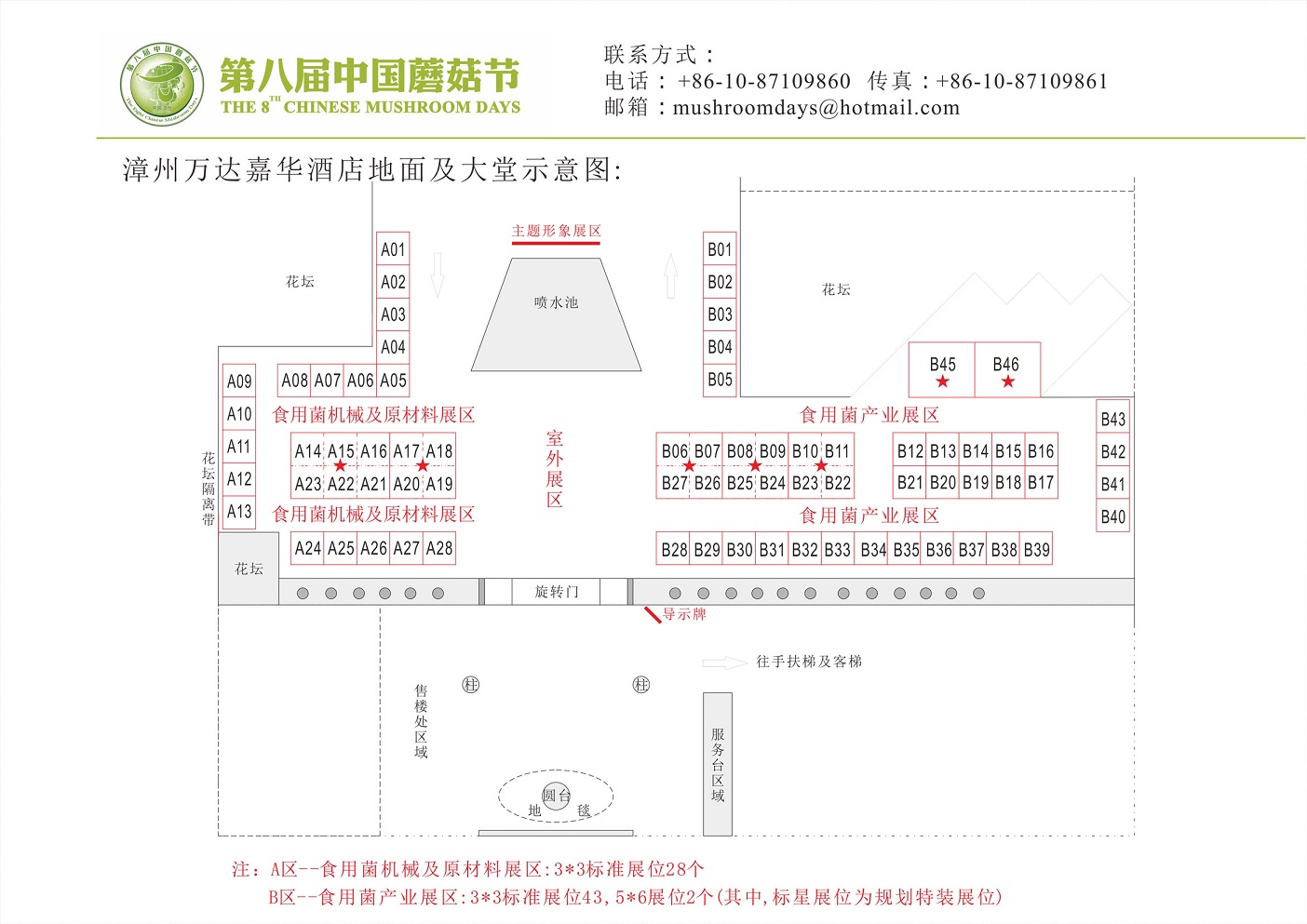 本届展览分为室内展区和室外展区,共计1,500平方米。其中室内展区为万达嘉华酒店三楼宴会前厅(正对蘑菇节论坛主会场出入口),设置标准展位12个。室外展区位于万达嘉华酒店室外停车场,设置标准展位68个,室外展区均搭设棚架,使其不受天气等外界因素影响。