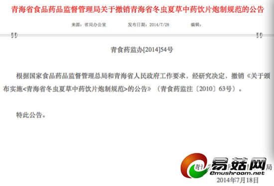据《青海省食品药品监督管理局关于撤销青海省冬虫夏草中药饮片炮制规范的公告(青食药监办[2014]54号)》,“根据国家食品药品监督管理总局和青海省人民政府工作要求,经研究决定,撤销《关于颁布实施的公告》(青食药监注〔2010〕63号)。”