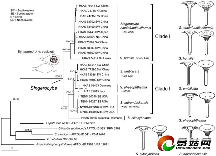 中国科学院东亚植物多样性与生物地理学重点实验室杨祝良研究组,通过近二十年来野外考察积累及与国内外同行开展合作,收集了来自欧洲、北美洲东部和西部、中国、日本、斯里兰卡和澳大利亚等地的囊泡杯伞属标本,由博士研究生秦姣通过四个基因片段的测序,重建了囊泡杯伞属真菌的系统发育关系,对该属的单系性、物种多样性和演化历史进行了研究。