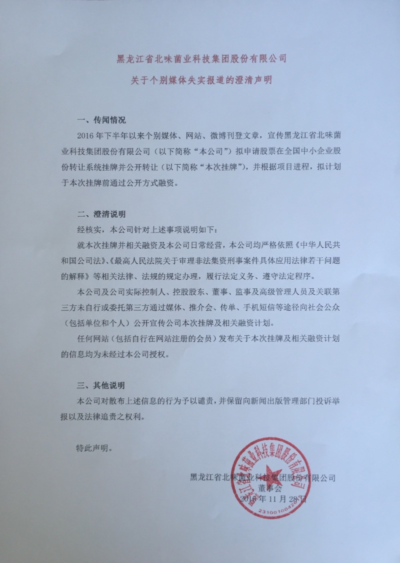 2016年下半年以来个别媒体、网站、微博刊登文章,宣传黑龙江省北味菌业科技集团股份有限公司(以下简称“本公司”)拟申请股票在全国中小企业股份转让系统挂牌并公开转让(以下简称“本次挂牌”),并根据项目进程,拟计划于本次挂牌前通过公开方式融资。