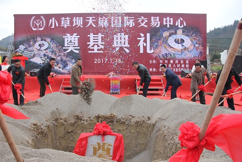 领导和嘉宾为彝良小草坝天麻国际交易中心培土奠基
