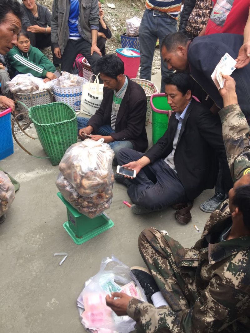 4个村子共51户人家,没有一家不采摘松茸的。像是赶集一样,藏民们背着竹篓陆陆续续从村子走到路边的收货点,不一会就聚满了人。