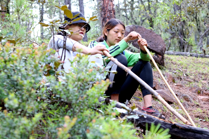 这是父女俩的暗语。清晨的山特别安静,扎史次姆弯腰低着头,盯着脚下,时不时拿手杖拨弄着大树下的杂草,不知不觉便与父亲走散了。在没信号的山上,一旦走散,这种原始的呼叫要比手机更加方便。