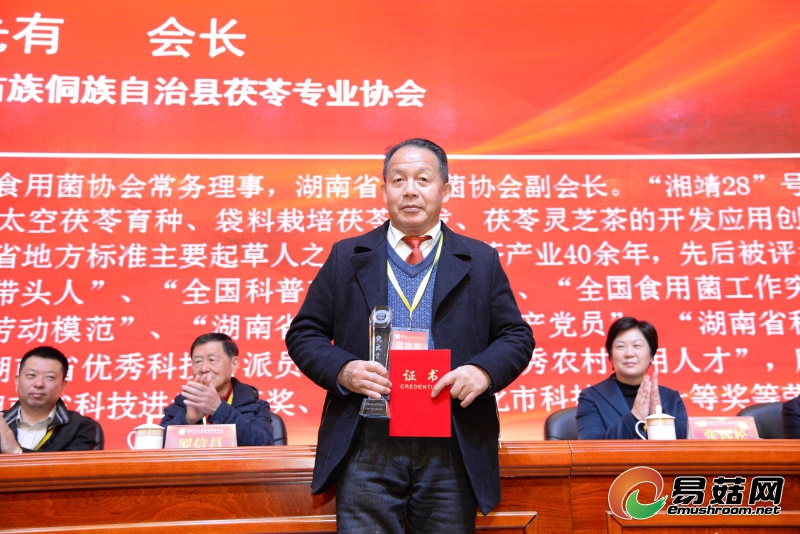 随后,大会组委会为靖州苗族侗族自治县茯苓专业协会会长王先有颁发了“茯苓产业发展突出贡献奖”。王先有是我国人工栽培茯苓创新技术的爱好者、坚持者,他长期扎根一线,成功选育茯苓新品种“湘靖28号”、神舟十号太空茯苓诱变育种,率先开发应用茯苓灵芝茶产品,是全国茯苓产业创新技术发展的重要参与者,在40年的茯苓生涯里,为我国茯苓事业做出了重要贡献。
