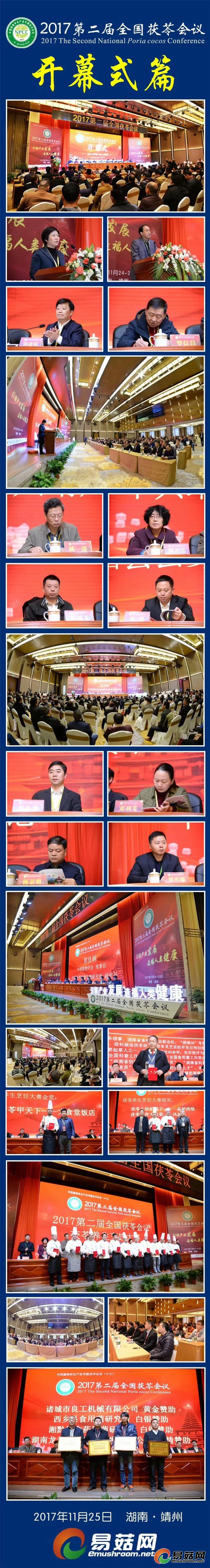 2017第二届全国茯苓会议于11月24-26日在湖南省靖州县举行,会议由中国菌物学会主办,靖州苗族侗族自治县茯苓专业协会、中国菌物学会菌物产业分会、易菇网等单位承办,会议安排了主题报告、专题报告共16个,同期举行了茯苓产业发展圆桌论坛、茯苓产业技术创新战略联盟成立会议暨第一届理事会第一次会议,茯苓养生烹饪大赛、茯苓会议展览等精彩活动,是继2014首届全国茯苓会议之后我国茯苓产业又一次盛会。