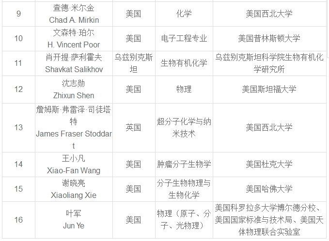 另外,16人新当选为中科院外籍院士,其中有2位诺贝尔奖获得者。