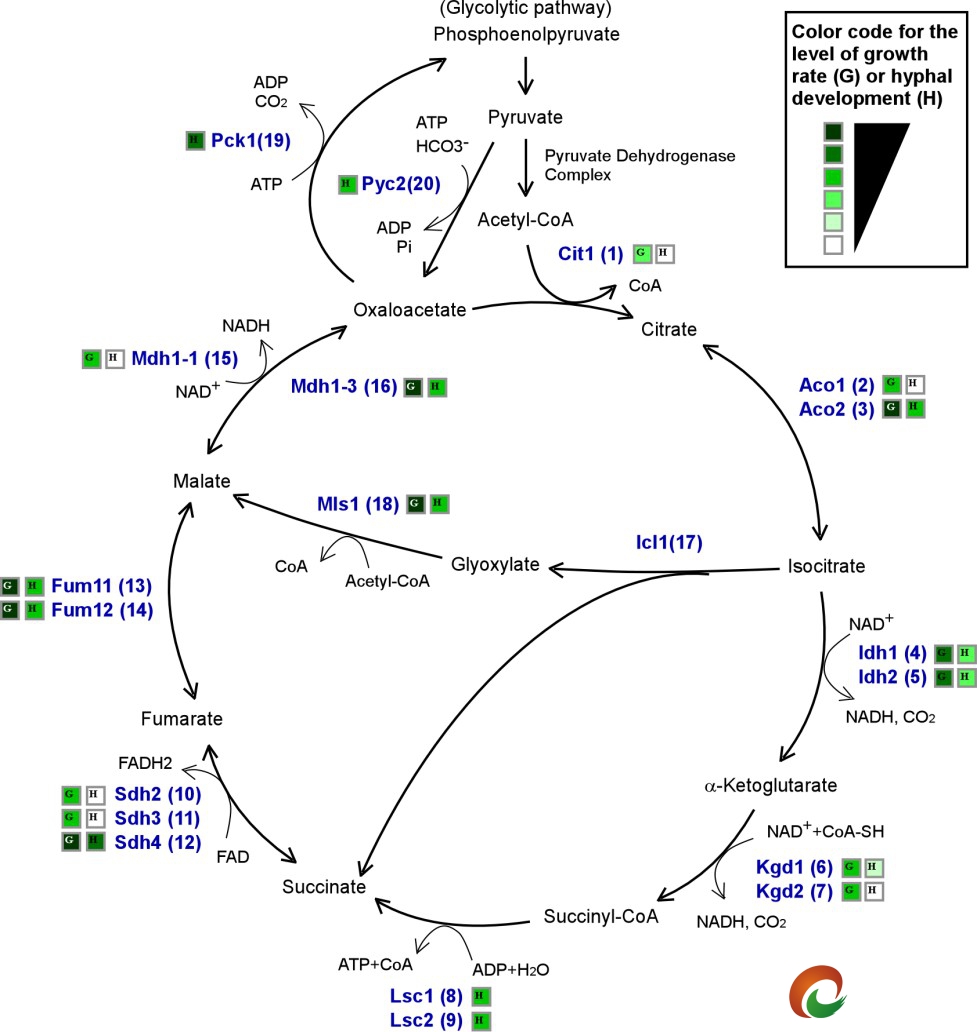 白色念珠菌是一种重要的人体致病真菌。每年由念珠菌引起的女性阴道感染病例达7500万,鹅口疮病例达1300万,血液和深部器官感染人数40万以上。由于对念珠菌基本生物学和感染机理的研究相对落后,目前临床上预防和治疗念珠菌病的药物非常有限。菌丝发育是白色念珠菌最重要的致病性特征,抑制菌丝发育导致该病原菌毒性急剧下降。因此,菌丝发育相关因子也是新型抗念珠菌药物的理想作用靶标。三羧酸循环(TCA)是所有生物物质和能量代谢的核心过程,通过产生“能量货币”ATP及代谢中间产物调控细胞重要生理活动。作为Crabtree阴性物种的白色念珠菌,TCA循环在适应人体宿主内低氧和高浓度二氧化碳环境尤为重要。