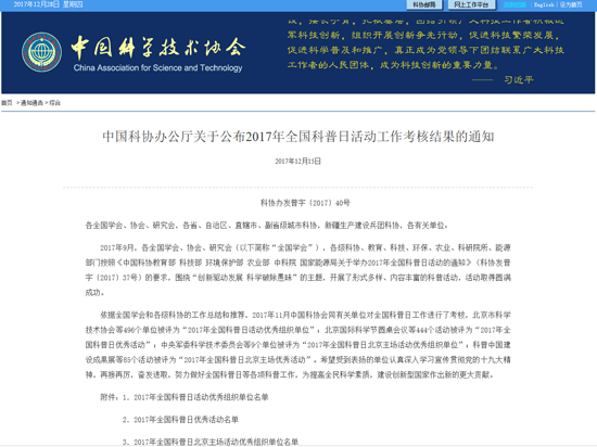 据了解,从2004年以来,全国科普日活动连续成功举办13年,对提高公民科学素质作出重要贡献。今年9月,按照《中国科协教育部 科技部 环境保护部 农业部 中科院 国家能源局关于举办2017年全国科普日活动的通知》,全国学会、各级科协、教育、科技、环保、农业、科研院所、能源部门围绕“创新驱动发展 科学破除愚昧”的主题,开展了形式多样、内容丰富的科普活动。