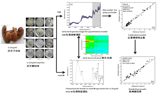 近年来,黄青课题组围绕灵芝育种及产品开发开展相关技术研究,特别关注灵芝有效成分检测分析方法。传统灵芝多糖含量测定方法繁琐低效,存在检测污染,不利于在发酵过程中快速定量分析。为此,课题组采用傅里叶变换中红外光谱和近红外光谱技术,此方法可实现灵芝发酵菌丝体快速高效、无损伤和无污染的定性定量检测分析。研究人员通过比较灵芝多糖提取步骤中不同阶段多糖含量与中红外光谱之间的对应关系以及多糖高低菌株之间的中红外光谱归属变化,判断出适合于灵芝发酵菌丝体多糖检测的中红外光谱特征区域;利用大量菌株的多糖含量数据及其近红外光谱的对应关系,结合多种算法,优化了定量模型选定光谱区域和预处理方式,构建了适合于灵芝液体发酵菌丝体的灵芝多糖含量定量分析模型。同时,他们分析和揭示了中红外光谱的特征区域与近红外光谱定量选定区域之间的对应关系,利用中红外光谱和近红外光谱检测结果可以互为补充验证,由此提高了模型的可靠性和准确性。