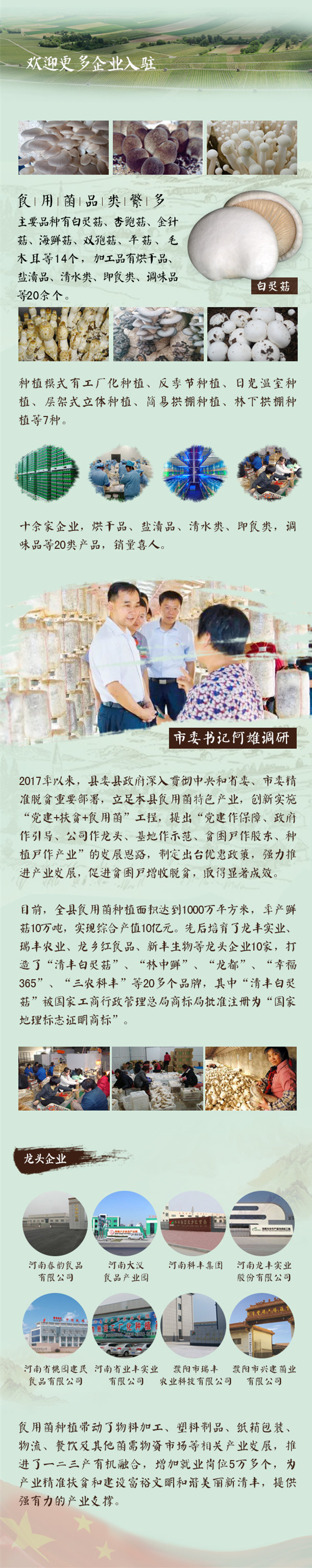 产业是清丰县重点扶持发展的特色产业之一,种植面积达到1000万平方米,年产鲜菇10万吨,实现产值10亿元。