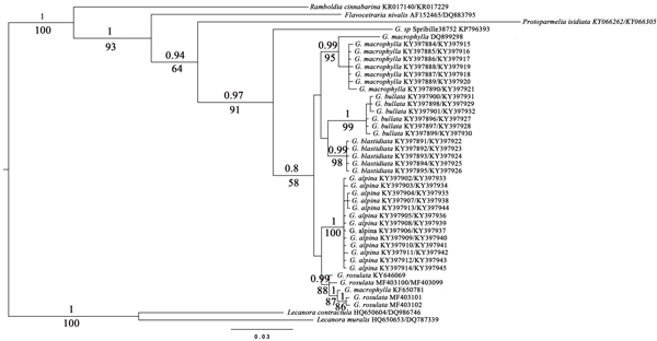 研究成果以“Three new species and one new combination of Gypsoplaca (lichenized Ascomycota) from the Hengduan Mountains in China” 为题,在真菌学期刊Mycological Progress上在线发表。化学部分以“Gypmacrophin A, a Rare Pentacyclic Sesterterpenoid, Together with Three Depsides, Functioned as New Chemical Evidence for Gypsoplaca macrophylla (Zahlbr.) Timdal Identification“为题发表。该研究得到了国家自然科学基金项目(No. 31670028, 31370069, 31400022, 31460005)的支持。