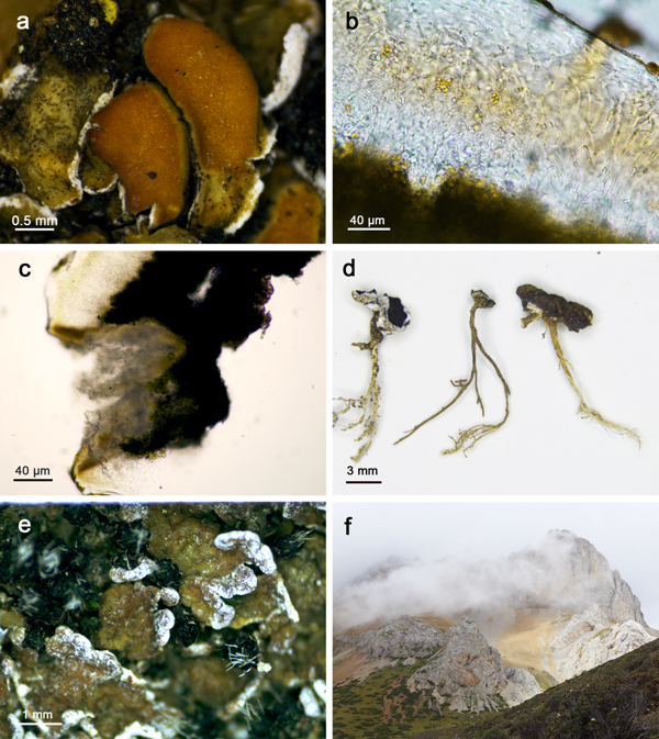 图2 a–d 大叶石鳞衣(14-45813) a. 地衣体与子囊果,b. 皮层,c. 分生孢子器,d. 假根;e. 类芽石鳞衣(16-51866);f. 石鳞衣的生境