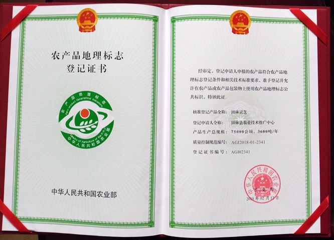据农业部第2651号公告,广西百色市田林县的“田林灵芝”成为2018年首批获准认证的国家农产品地理标志登记产品,也是田林县继2014年获得国家经济林协会授予“中国灵芝之乡”称号之后的又一个国家级的称号。