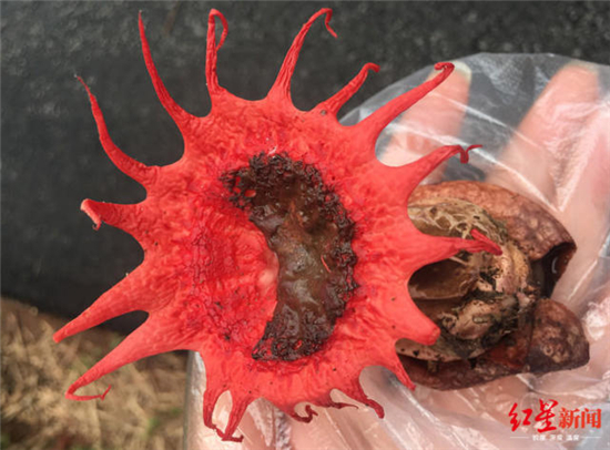 “时隔一天,它的触角已经蔫了不少,臭味也明显减弱。”5月26日中午,罗兴伟领路,红星新闻记者找到了这个长得像海葵的蘑菇,它的颜色仍然特别鲜艳。