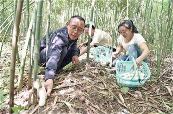 “我们种的是长裙竹荪,是竹荪里品种最好的。”林下竹荪示范区负责人姚永久说,目前市场上的竹荪,绝大多数是大棚种植。了解到当地竹林资源丰富,生态环境较好,他和几位朋友一起在当地流转竹林,做起了林下竹荪项目。第一批试验基地有120亩,今年5月开始种植,种植原料全部使用竹子,让竹荪在竹林里自然生长。10多天前,竹荪开始陆续成熟,品质非常好。种植林下竹荪,一年下菌种,每年收一季,主要是9月至10月,可以采收五年,在竹笋出来的时候,还能采收竹笋,都是天然食品。在种植期间,他们也解决了当地农民的就业问题,一天120元的工资,最多时,一天需要20多个人工。