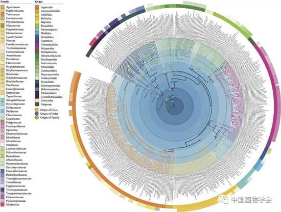 为此,中科院微生物所赵瑞琳团队集结了近十年来担子菌门分类研究的新进展,首先在多基因及基因组层面对整个门的系统发育关系开展研究,并估算了目前担子菌门内亚门、纲、目、科的演化时间范围分别为406-490 Mya,245-393 Mya,120-290 Mya,27-222 Mya,具体包括:6个基因(LSU, SSU, 5.8s, rpb1, rpb2, ef1)的多基因系统发育图谱、116个代表种的396个直系同源基因的系统发育基因组图谱研究;及771个代表种分子钟分析推算了科和科以上的分类阶元的演化时间(图1)。为建立担子菌门标准化分类系统中的各分类等级的演化时间标准提供了依据。