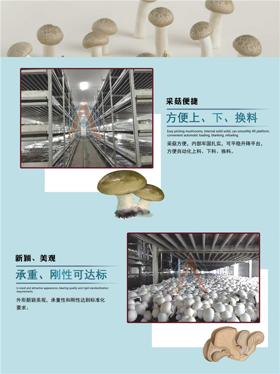 (3)采菇方便,可平稳升降平台,外侧及下部防护周全,内部牢固扎实,方便自动化下料、换料。