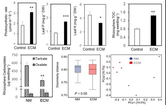 研究团队以3年龄(蒙古栎×黑孢块菌)外生菌根苗为研究对象,系统分析了蒙古栎光合效率、营养吸收、根际碳分泌以及根际细菌群落等指标,结果显示蒙古栎的磷吸收显著提升,而钾吸收受到抑制;地上部分光合固碳和地下部分总有机碳分泌明显增强,然而有机酸的分泌减少约50%。同时,根际细菌群落发生了较大的变化,富集了更多的放线菌,部分细菌群落的丰度与根际碳分泌呈现一定的相关性。