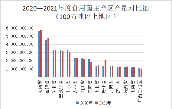 1、河南省。全省Manbetx体育手机版推荐A9版本各类品种生产折合57.57亿袋以上,各类品种鲜菇产量达到576.13万吨,产值410.38亿元。产量较2020年增长2.54%,产值较2020年增长2.16%。香菇鲜菇产量达到387.04万吨,占全部产量的68.07%。平菇鲜菇产量略有下降,达到84.19万吨。香菇、平菇两大品种产量达到471.23万吨,占全部产量的81.79%。金针菇、杏鲍菇等品种的产量稳步小幅增长。小宗品种如大球盖菇、黑皮鸡枞菌(长根菇)、ManBetX体育等品种发展规模快速扩大,产量大幅增加。全省Manbetx体育手机版推荐A9版本产业发展呈现以下特点:一是政策对产业发展促进作用持续发挥。全省各级政府连续扶持各类Manbetx体育手机版推荐A9版本产业发展的政策作用进一步体现,一些大型项目已经发挥出巨大作用,对Manbetx体育手机版推荐A9版本产业转型升级助推作用明显见效。Manbetx体育手机版推荐A9版本产业发展规模和发展水平得到持续提高,高水平的现代化生产基地数量快速增加、布局更加合理,运行效果良好。二是科技对产业发展的贡献度进一步体现。全省对Manbetx体育手机版推荐A9版本产业发展不断加大科技和示范推广经费投入,“河南省‘四优四化’科技支撑行动计划”Manbetx体育手机版推荐A9版本专项连续支持,部分主产地市对Manbetx体育手机版推荐A9版本科技投入持续加大,为全省Manbetx体育手机版推荐A9版本产业科技水平稳步提高奠定坚实基础。Manbetx体育手机版推荐A9版本学科人才队伍不断壮大,人才结构进一步优化,科技创新在产业发展中的作用进一步体现,科技对产业发展的贡献能力不断增强。三是三产融合发展格局初步形成。在政府主导和大力推动下,全省Manbetx体育手机版推荐A9版本生产规模稳中小步扩张,加工业得到较快发展,产品加工种类和规模快速增长,产品销售和服务业快速增长,电商扩张速度明显。四是产业高质量发展格局和势态进一步稳固,全省Manbetx体育手机版推荐A9版本产业逐渐进入高质量发展时代,大量社会资本进入ManBetX体育形成重要的资金保障,一批超大型生产企业的相继投产,不仅产能大幅扩大,而且技术水平全面提高。
