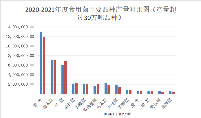 18个品种产量增长:金福菇1719.66%、鹿茸菇300.25%、松茸130.07%、长根菇(黑皮鸡枞)65.05%、天麻56.82%、其他菇31%、真姬菇26.43%、秀珍菇21.69%、牛肝菌20.40%、茯苓/猪苓17.88%、红椎菌17.84%、毛木耳16.65%、灵芝10.92%、香菇9.05%、姬松茸7.98%、大球盖菇5.80%、灰树花0.29%、滑菇0.16%。
