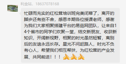 学员们纷纷表示不仅学习了解到大球盖菇的相关知识,而且通过实践掌握了其专业的栽培技能,可谓收获满满!对于老师们的倾情授课与悉心教导、组委会精心设计的课程和“黄埔菌校”优美的校园环境表示了极力认可与称赞!