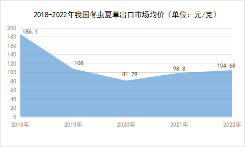 过去一段时间,冬虫夏草的出口价格出现下降趋势,到2021年出口价格开始回暖。2021年冬虫夏草的平均价格为98.8元/克,较2020年有所回升。受新冠疫情的影响,全球人民对身体健康的重视程度加大,同时对冬虫夏草保健的需求不断提升,预计到2023年,冬虫夏草的出口单价仍将保持上涨态势。