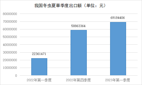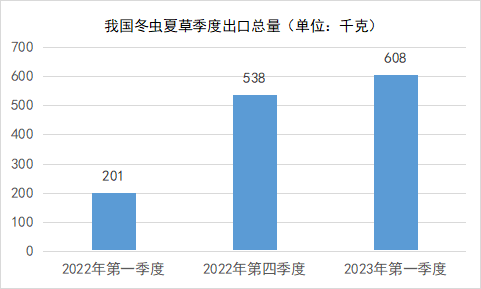 2023年第一季度我国冬虫夏草出口约608千克,销售总额约6918万人民币,比2022年第一季度销售总额多出5705万元,同比增长255.14%。比上个季度增加1032万元,环比增长17.53%,冬虫夏草销售额度增加显著。