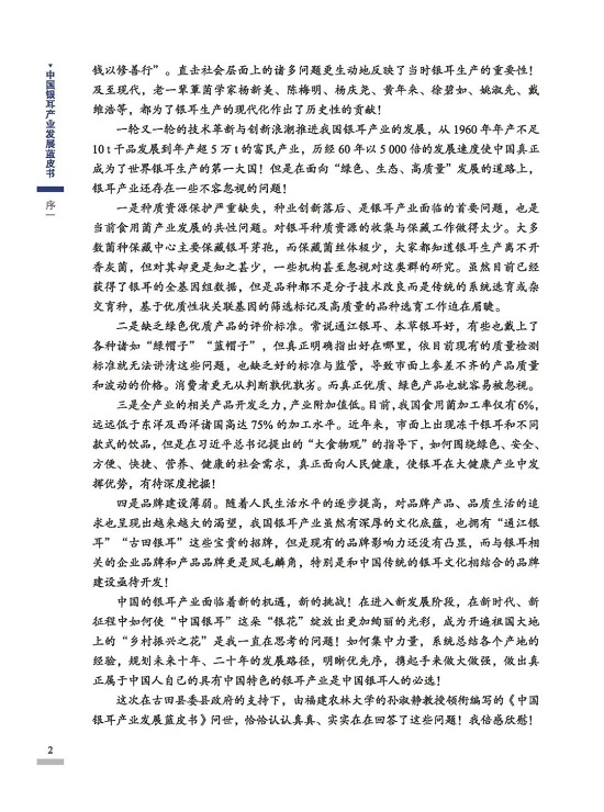 据蓝皮书主编、福建农林大学生命科学学院副院长、福建农林大学(古田)菌业研究院院长孙淑静介绍,蓝皮书系统阐述了大健康和乡村振兴战略背景下,我国银耳产业面临的机遇与挑战,记录了我国银耳主产区的产业发展现状。同时,聚焦新时代、新征程背景下银耳产业发展的热点问题,梳理了银耳产业在种业创新、绿色生产、精深加工、品牌建设和营销及全产业链数字化平台建设等方面的现状及问题,提出了推动我国银耳产业向现代化发展的实施路径。