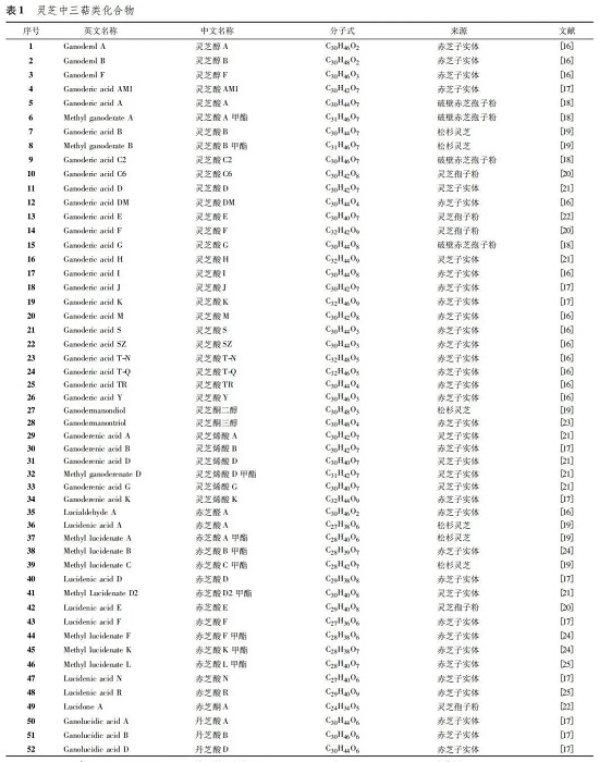 灵芝三萜类化合物主要为四环羊毛脂烷型三萜和五环三萜。Takashi等首次从赤芝中分离得到灵芝酸A和B。现从灵芝中分离得到的三萜类成分已超过300个。灵芝中主要的三萜类成分见表1。