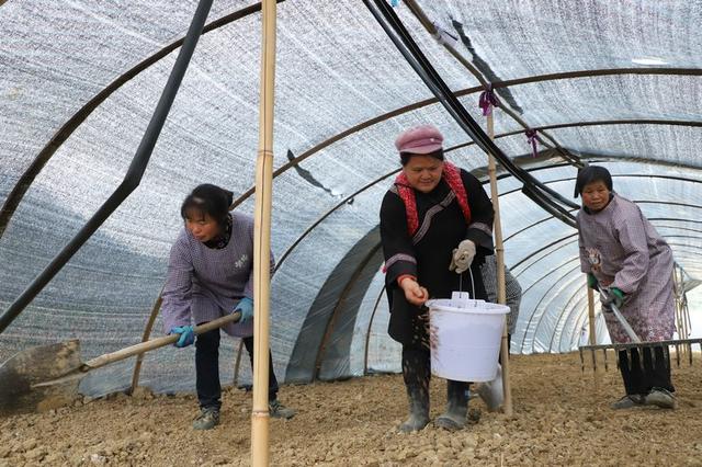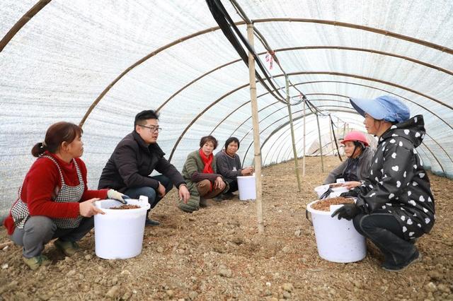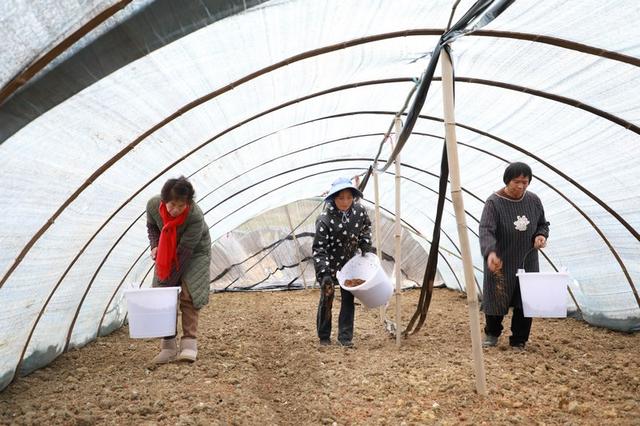 “像我们一个标准棚,菌种基本上撒五桶左右,我们就直接这样抛高一点,把它撒均匀……”现场进行简单的种植培训后,几十个村民便分散到各个大棚内,翻土地、播菌种、培土。