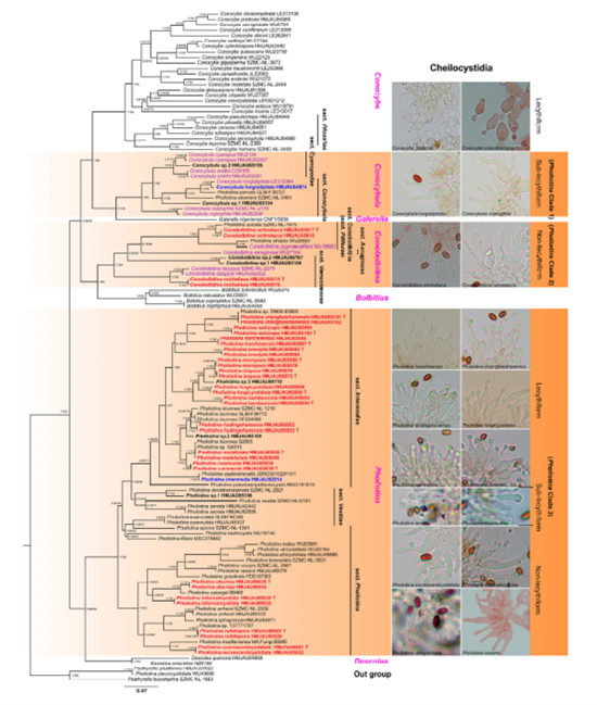 该研究利用中国材料和可靠的基因序列来拟合形态学和系统发育,重建了小鳞伞属(广义)Pholiotina sensu lato的系统发育关系,采用核糖体DNA内转录间隔区(nrITS)、核糖体DNA 28S(nrLSU)和转录延伸因子(tef1-α)的合并数据集进行了最大似然和贝叶斯分析。研究结果显示,小鳞伞属(广义)Pholiotina sensu lato包括3个分支:Pholiotina Clade 1、Pholiotina Clade 2和Pholiotina Clade 3。该课题组在Pholiotina Clade 1中建立了一个新属——小锥盖伞属Conocybula Bau T. & Song H.B,与尼日利亚小帽伞Galerella nigeriensis为姊妹类群。现阶段小锥盖伞属Conocybula包括蓝色组sect. Cyanopodae和小锥盖伞组sect. Conocybula两个组。将Pholiotina Clade 2另立为一个新属——锥粪伞属Conobolbitina Bau T. & Song H.B,包括锥粪伞组sect. Conobolbitina(= sect. Piliferae)、铜绿盖组sect. Aeruginosa和疣孢组sect. Verrucisporae三个组。并对小鳞伞属Pholiotina的界限和定义进行修订,将具有菌幕的单系群Pholiotina Clade 3作为真正的小鳞伞属Pholiotina。小鳞伞属Pholiotina现只包括小鳞伞组sect. Pholiotina、被外菌幕组sect. Vestitae和过渡组sect. Intermediae。该研究发现并报道了30个新的分类群,包括2个新属、17个新种、11个新组合和2个中国新记录,并编制了中国粪伞科Bolbitiaceae中各属、各组和各物种的检索表。提供了17个新物种和2个新记录种的描述和线条图。解决小鳞伞属(广义)Pholiotina sensu lato内各属、各组和物种的划分难题,从中还发现和探讨了粪伞科Bolbitiaceae中各属和属下等级之间可能的系统发育关系和演化趋势。