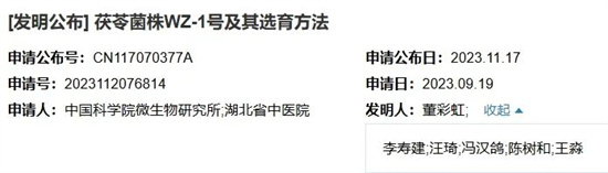 目前,茯苓新菌株WZ-1号已经由中国科学院微生物研究所和湖北省中医院(湖北省中医药研究院)联合申请专利。