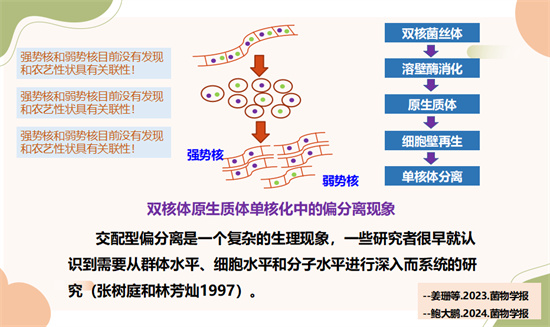 此外,鲍大鹏研究员还对群体水平的偏分离现象、双核体核相转换在杂交育种价值等进行展开叙述。鲍大鹏研究员表示,在原生质体单核化时,会出现两个单核体分离比例失衡的偏分离情况。将大量出现的细胞核定义为强势核,极少出现的为弱势核,目前二者与农艺性状无关联。对香菇和金针菇的研究揭示,强势核和弱势核存在 “遇强则弱,遇弱则强” 的有序关系,自然界无性孢子形成过程也存在偏分离。