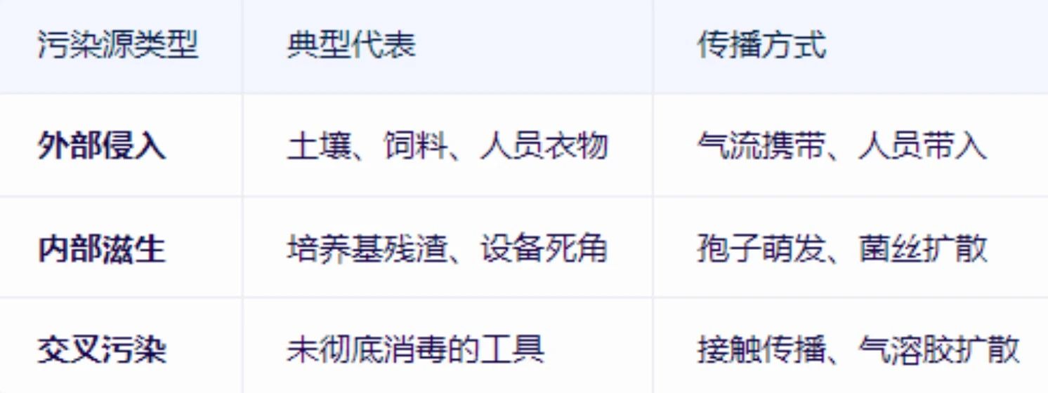要有效防控霉菌,必须先明确其来源。在工厂化菌种培育车间,污染主要来自以下几个方面: