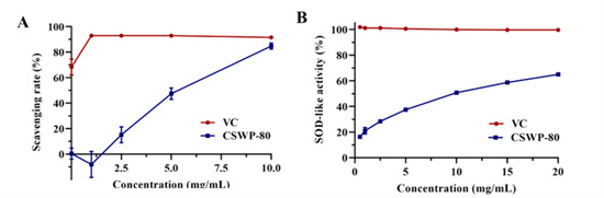 在DPPH自由基清除、SOD超氧化物歧化酶活性测定中,多糖CSWP-80表现出了显著的抗氧化能力。
