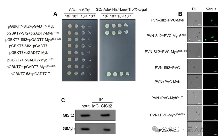 二、GlSlt2磷酸化修饰转录因子GlMyb。为了探究GlSlt2调控纤维素利用的分子机制,通过酵母双杂交(Y2H)文库筛选发现GlSlt2与R2R3型GlMyb转录因子结合。并通过Y2H实验、双分子荧光互补(BiFC)实验和免疫沉淀实验进行验证(图2)。GlSlt2作为蛋白激酶,能够磷酸化修饰相互作用的蛋白。通过体内、体外磷酸化实验验证了GlSlt2对GlMyb的磷酸化,并找到了245位丝氨酸是磷酸化修饰的位点(图3)。