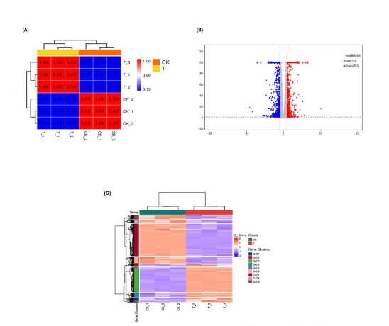 图3 (A)样本间基因表达水平相关性热图,(B)差异表达基因统计分析,(C)差异表达基因聚类分析