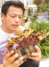 8月29日,即墨温泉镇西四舍山村村民吴宗杰在村后的四舍山上采蘑菇时,无意间在一棵大树下峭壁上挖到了一棵半斤重、脸盆大小的巨型“花草”。昨天上午,经即墨市林业局森保站相关专家鉴定,这棵奇异“花草”竟然是生长在山涧多年、有很高药用价值的野生灵芝。