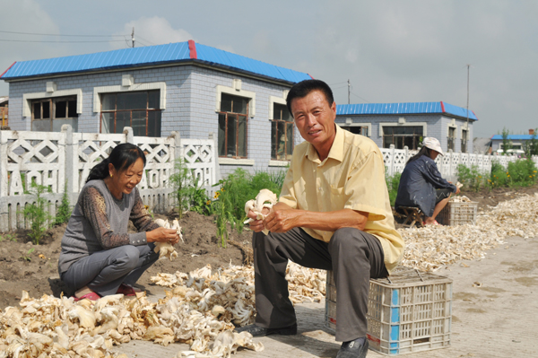 | 盛夏时节不是平菇销售的旺季,杜亚军(前)和家人把鲜平菇晒干,相机卖出。由于干平菇的价格高,收入相当可观。 |