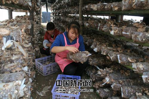 两当县深山林区的泰山乡利用当地林木资源优势,引导农民大力发展袋料香菇种植,让农民当年增加收入,目前全乡已发展香菇种植大户30多户、建立香菇种植大棚120多个,出产的香菇销往河南、陕西等地,创收达400多万元,图为她们在大棚内采摘香菇的情景。