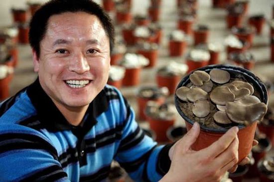 11月6日,农民张国明面对镜头展示他试种成功的盆栽虎皮蘑菇,掩饰不住内心的喜悦。盂县西潘乡进圭村农民张国明今年9月在该村投资3万元启动山西首家盆栽