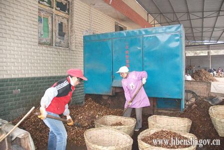 在圣峰药业有限公司的院内,只见几十名工人正在紧张忙碌着,有的在成堆的葛根前将葛根往下运,有的坐在原料旁熟练地将葛根切成片或是颗粒,有的推着小车将切好的葛根颗粒运往无硫炕房等待入炕,有的将炕好的成品起运出炕,除了人工刀切外,现场还有个大型的自动切割机,切割机旁的两名工人不停地将切割好的葛根颗粒铲入容器内,“我们春节期间一直都没休息,这里一共是2800公斤葛根,都是上海、杭州一些商家预定了的,我们还要加紧使劲儿干,有的还要出口到国外呢!”现场一位正在运送葛根成品的工人师傅对笔者说道。机器轰鸣声、刀切声、吆喝声汇成了一曲欢快的交响曲。
