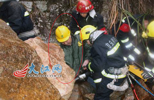 一名村民(红圈中人)被巨石压住右臂,消防官兵现场救援。