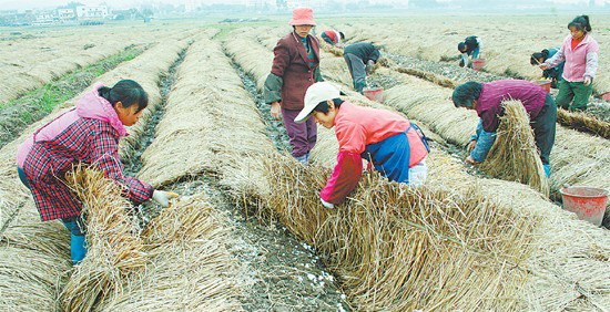 3 月4 日,广西武宣县桐岭镇瑶兰村农民翻开稻草采收无粪无棚栽培的蘑菇。武宣县农业部门引进无粪无棚栽培新技术指导桐岭、通挽等乡镇农民种植,其不需盖棚,不必培粪,且种后20 天即可产菇,比常规种植快20 天左右,每平方米可产菇13 公斤,产量增、质量好、投资少、见效快、效益高,已成为当地农民致富的新渠道。(陈冬梅 刘革 摄影报道)