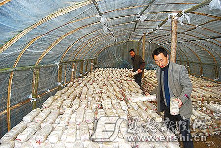 3月10日,湖北巴东县绿葱坡镇农村青年李俊在自家的香菇棚里劳作。过去在外打工的李俊回乡创业,今年计划种植2万袋香菇,预计实现收入8万元。(恩施新影像传媒网 田植峰 摄)