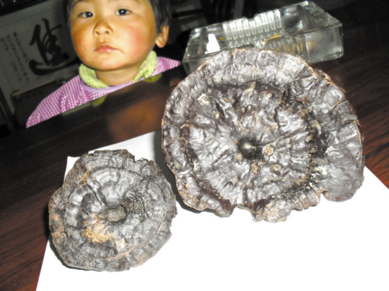 昨日,笔者看到,这两朵野生灵芝呈深褐色,柄为深紫色,大的直径12厘米,厚1.5至2厘米,高16厘米;小的直径8厘米。